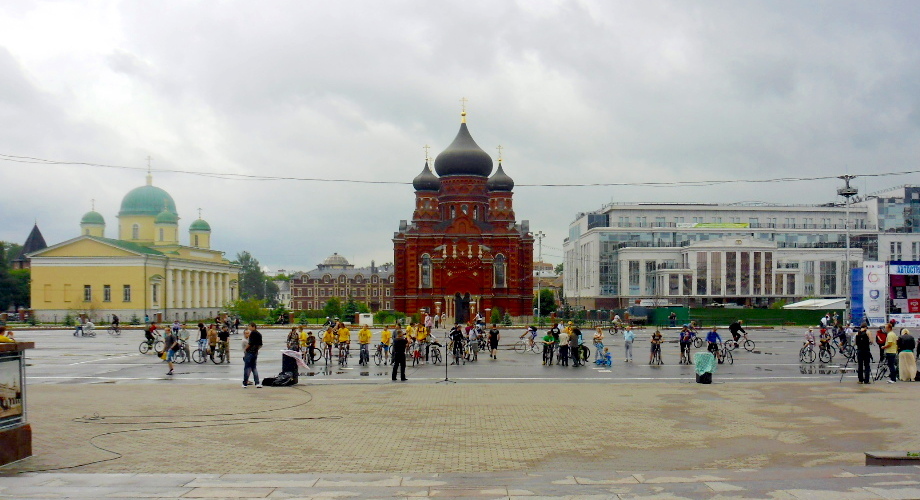 В самом начале шел небольшой дождь и это, наверняка, испугало многих. Но когда мы приехали на площадь, дождь закончился. Поначалу, велосипедистов было мало. Когда всех попросили выехать на дорогу и приготовиться к старту, визуально людей стало заметно больше. На мой взгляд, было человек 80. На велопролег ушло минут 5 времени, не считая ожидания.