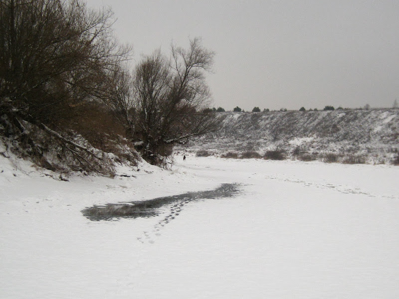 На участке между Головнино и Горенское Ока делает сильную петлю. Чтобы не терять времени, решили эту петлю срезать по полю. Затем, лед пошел уже получше и средняя скорость держалась на уровне 13-15км/ч. Но до Калуги было еще далеко... Честно говоря, не помню, делали ли мы еще остановки на перекус или нет. Кажется, не делали, т.к. надо было ехать.